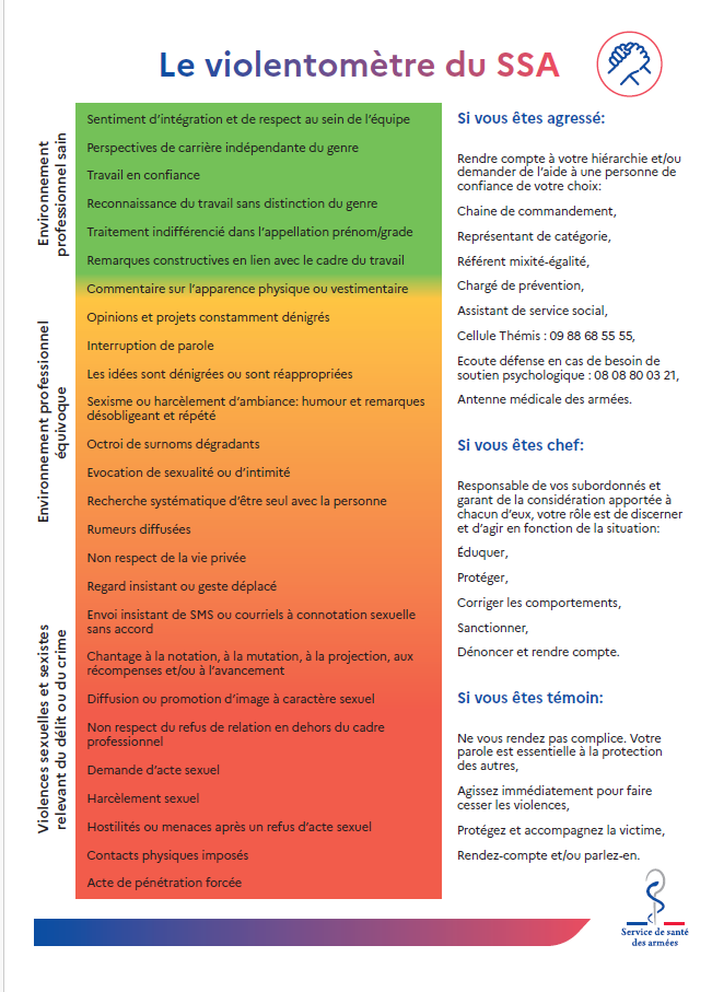 Le Service de santé des armées (SSA) déploie un violentomètre professionnel pour sensibiliser les militaires aux comportements sexistes, discriminatoires ou